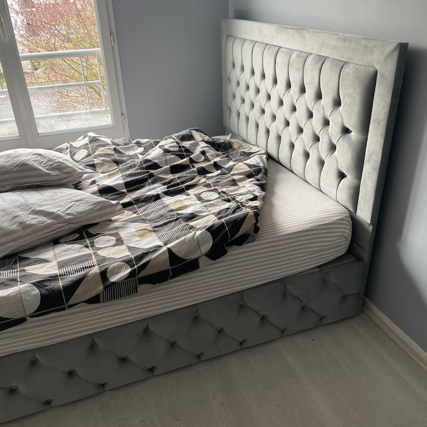 Le cadre de lit ROMA gris, disponible en 3 dimensions : 140x190, 160x200 et 180x200, au choix avec ou sans sommier, tissu velours gris de qualité, structure et style en métal renforcé et durable, LITERIE DELUXE vous attend avec ses modèles raffinés et uniques qu'il s'agisse d'un lit simple ou un lit double.