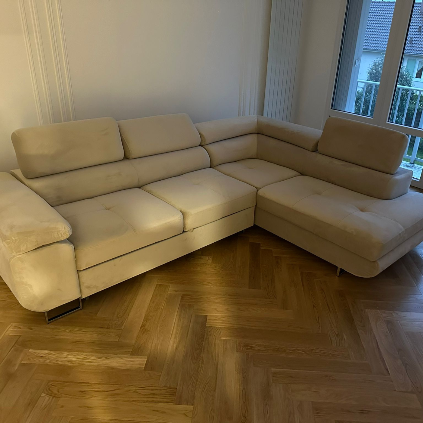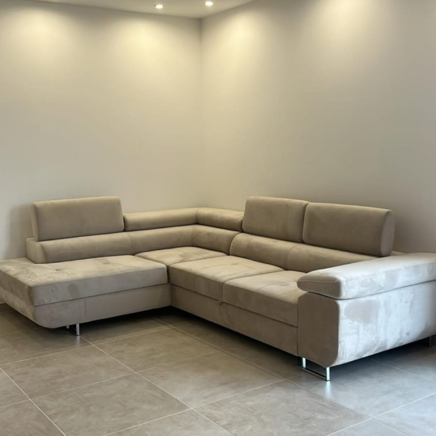 Offrez à votre salon un mélange parfait de style moderne et de praticité avec le canapé d'angle TONY. Son design épuré et son revêtement en velours beige apportent une touche chaleureuse et raffinée à votre espace de vie. Pensé pour s'adapter à vos besoins, ce canapé propose une assise spacieuse, un couchage convertible pratique et un coffre de rangement intégré pour optimiser votre espace.
