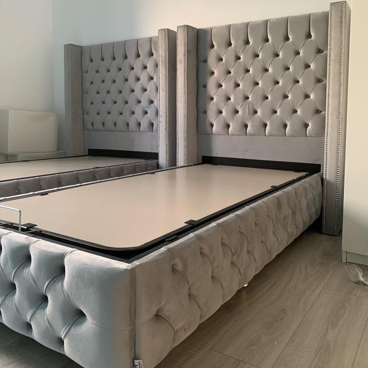 Lit coffre CLOUTE velours gris avec tête de lit capitonné